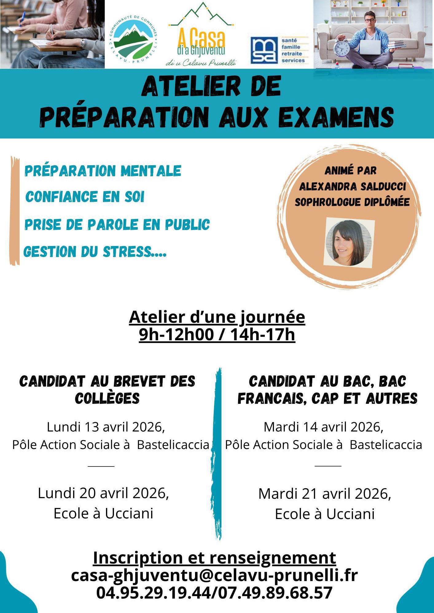 A Casa di a Ghjuventu di u Celavu Prunelli propose des ateliers de préparation aux examens pour t'aider à aborder tes épreuves dans de bonnes conditions. Que tu prépares le brevet, le bac, le bac français, un BEP ou un CAP, ces sessions sont là pour te donner des outils concrets.